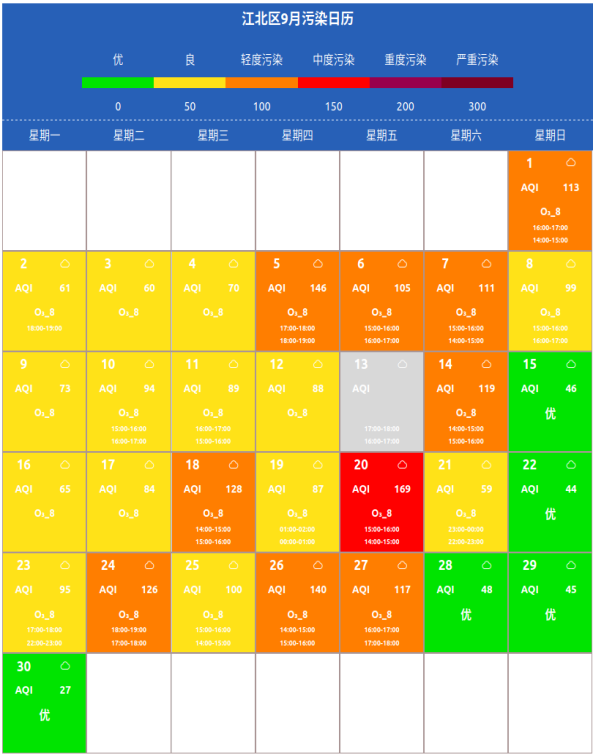 本月空氣質量“5優14良9輕度污染1重度污染 ”,優良率65.5%。