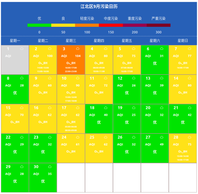 本月空氣質量“14優14良1輕度污染 ”,優良率96.55%。