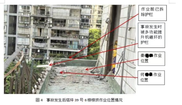 2024年9月11日7時許,建富強建筑公司該項目班組長張**,組織工人在江北區觀音橋塔坪39號樓冒廳頂部安裝提升機,9月11日12時完成安裝。9月12日,張**在提升機未進行驗收的情況下,開始組織本班組人員利用該提升機進行吊裝作業。9月15日20時許,張**安排本班組工人何**、秦**、郝**、龐**4人,于9月16日到塔坪39號樓繼續利用提升機,從事樓頂防水工作所需材料吊運工作。張**于9月16日5時30分許,請假離開項目。9月16日6時15分許,郝**、龐**、何**、秦**4人到達塔坪39號樓開始作業(吊裝現場無專人進行安全管理),郝**在一樓側面負責往斗車內裝石粉和水泥,龐**負責在屋面冒廳頂部操作提升機,何**、秦**負責在6樓樓頂走廊將吊運上來的材料,從斗車內轉運至6樓樓頂。該4人事發前先用小斗車吊運了一斗車水泥(四包水泥,每包50公斤)和一滿斗車石粉,7時5分許,更換大斗車滿裝吊運石粉時,位于屋面冒廳頂部的提升機發生傾覆墜落,砸中何**和秦**以及二人所處位置走廊護欄,導致何**隨提升機、斗車和該提升機用于配重的泥土袋墜落至一樓地面,當場死亡,秦**小腿受傷和6樓樓頂走廊護欄部分損壞。