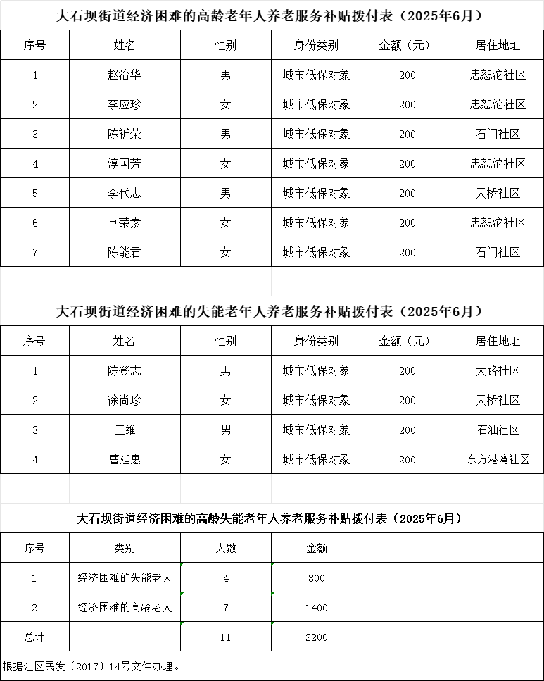 大石壩街道2025年6月經(jīng)濟困難的高齡和失能老年人養(yǎng)老服務(wù)補貼撥付表
