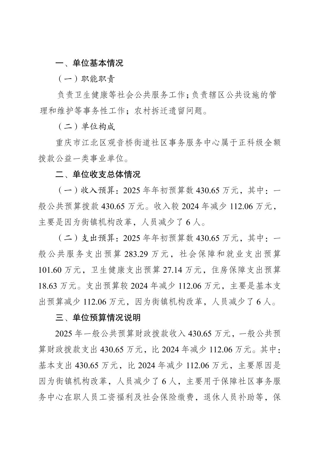 重慶市江北區(qū)觀音橋街道社區(qū)事務(wù)服務(wù)中心2025年單位預(yù)算情況說明