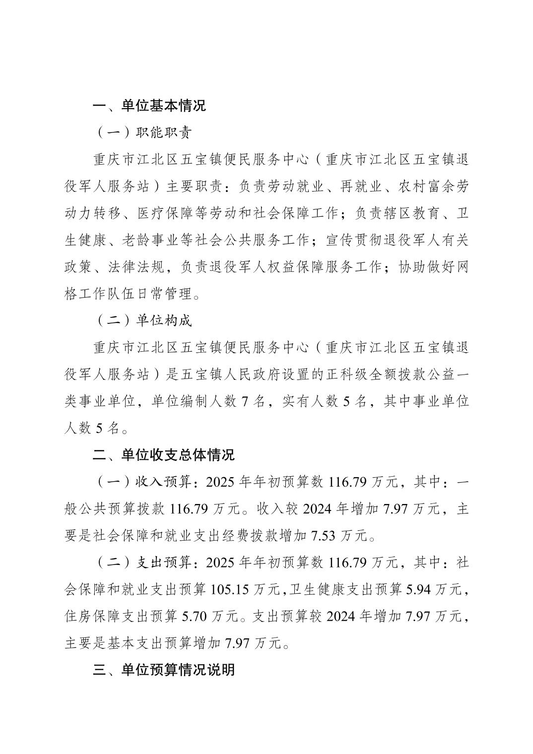 江北區(qū)五寶鎮(zhèn)便民服務(wù)中心(江北區(qū)五寶鎮(zhèn)退役軍人服務(wù)站)2025年單位預(yù)算情況說明