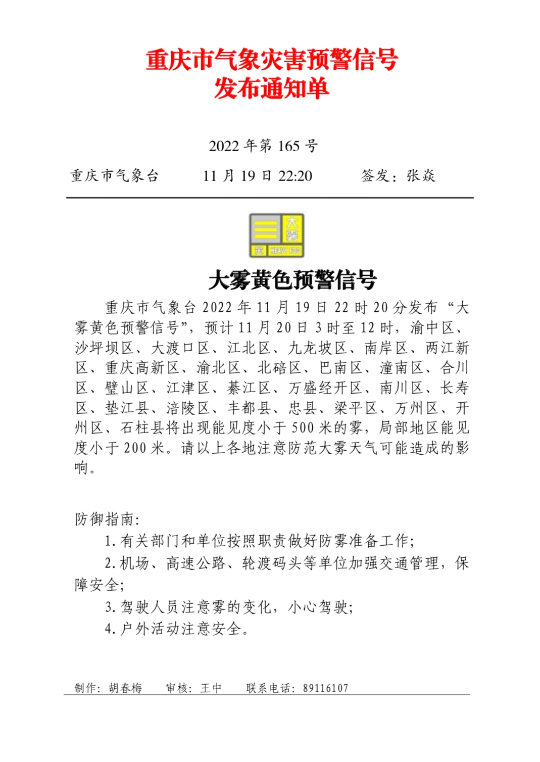 重慶市氣象災害預警信號發(fā)布通知單(2022年第165號)